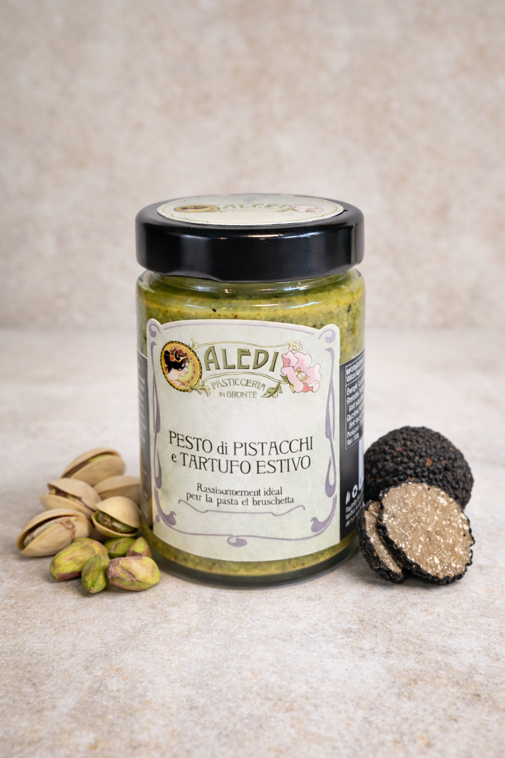 Il Pesto di Pistacchi e Tartufo Estivo è un condimento raffinato che unisce l’intensità del pistacchio (ben il 60%) al profumo elegante del tartufo estivo. Una salsa cremosa e aromatica, pensata per trasformare ogni piatto in un’esperienza gourmet.